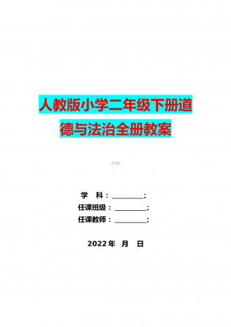 人教版小学二年级下册道德与法治全册教案学科:;任课班级:;任课教师:;2022年月日2021-2022学年度第二学期教学进度表科目道德与法制教学班级二年级教科书名称及册数(2018年审定)人教版版二年级下册道德与法制每周节数节总授课节数180节时间单元教学内容计划节数实授节数出入原因第周第一单元让我试试看1挑战第一次2学做“快乐鸟”3做个“开心果”4试种一粒籽第周第二单元我们好好玩5健康游戏我常玩6传统游戏我会玩7我们有新玩法8安全地玩第周第三单元绿色小卫士9小水滴的诉说10清新空气是个宝11我...