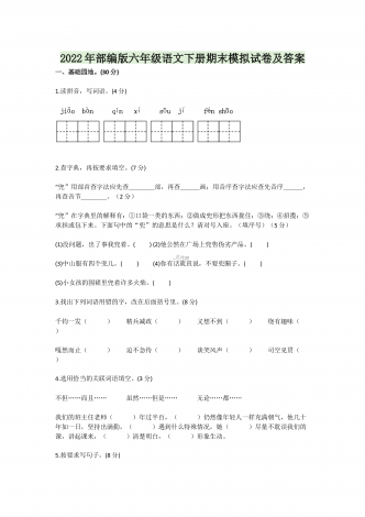 2022年部编版六年级语文下册期末模拟试卷及答案一、基础园地。(30分)1.读拼音,写词语。(4分)2.查字典,再按要求填空。(7分)“兜”用部首查字法应先查____部,再查___画;用音序查字法应查先音序___,再查音节____。(2分)“兜”在字典里的解释有:①口袋一类的东西;②做成兜形把东西拢住;③绕;④招揽;⑤承担或包下来。下面句中的“兜”的意思是什么?请对号入座。(填序号)(5分)(1)没问题,出了事我兜着。( )(2)他公然在广场上兜售伪劣产品。( )(3)中山服有四个兜儿。( ...
