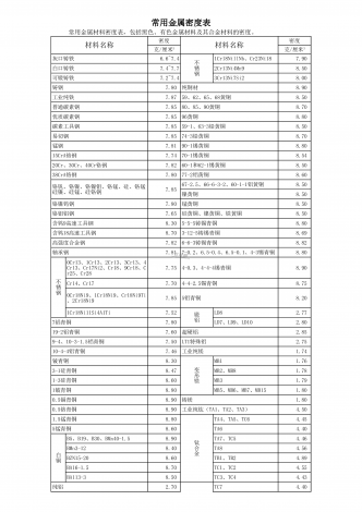 常用金属材料密度表,包括黑色、有色金属材料及其合金材料的密度