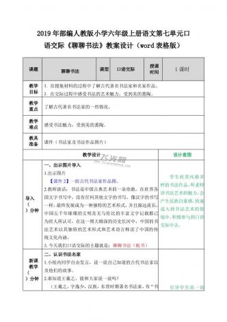 2019年部编人教版小学六年级上册语文第七单元口语交际《聊聊书法》教案设计(word表格版)