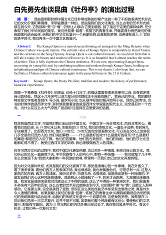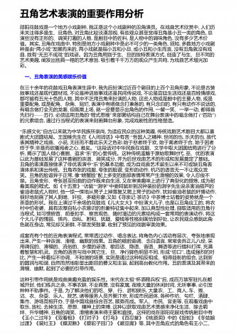丑角艺术表演的重要作用分析邵阳花鼓戏是一个地方小戏剧种,我正是这个小戏剧种的丑角演员。在戏曲艺术欣赏中,人们历来关注得多是生、旦角色,对丑角比较淡漠忽视,有些观众甚至觉得丑角是小丑一类的角色,总演些没有正形的、调笑打趣的人物,是剧目中的佐料,是人物中的调味角色,没有多少艺术价值。其实,丑角在戏曲中,特别是地方小戏剧种中是必不可少的一类角色,须知,多数地方小戏剧“”种是由两小戏发展而来的,两小戏就是指小丑和小旦,或小丑和小生而言,没有丑角就没有戏曲,“”故有无丑不成戏的戏谚。因为丑角用别于生、旦的...