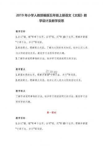 2019年小学人教部编版五年级上册语文《太阳》教学设计及教学反思