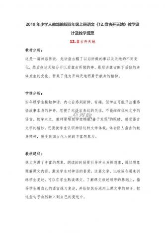 2019年小学人教部编版四年级上册语文《12.盘古开天地》教学设计及教学反思