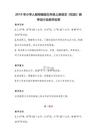2019年小学人教部编版五年级上册语文《松鼠》教学设计及教学反思