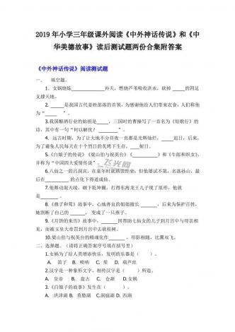 2019年小学三年级课外阅读《中外神话传说》和《中华美德故事》读后测试题两份合集附答案