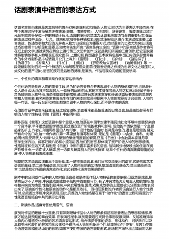 话剧表演中语言的表达方式话剧名称的由来就是因其独特的舞台戏剧表演形式和演员(人物)以对话为主要表达手段而来,在整个表演过程中演员虽然还有表演(表情、情感变换)、人物造型、场景设置、服装道具以及灯光音响效果等多位一体的辅助手段,但语言的使用仍然成为话剧表演成功与否的重要标志.在话剧表演过程中,音乐、灯光、效果和歌唱等各种辅助表现形式使用较少,整个表演过程主要以语言表达、叙述故事和大段的无伴奏人物对白或独白为重要方式,此时语言的功效尤为突出,语言技巧的使用十分明显和重要,正如老舍先生所言:"语言是有...