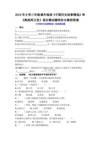 2019年小学三年级课外阅读《中国历史故事精选》和《海底两万里》读后测试题两份合集附答案