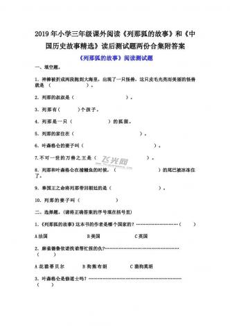 2019年小学三年级课外阅读《列那狐的故事》和《中国历史故事精选》读后测试题两份合集附答案