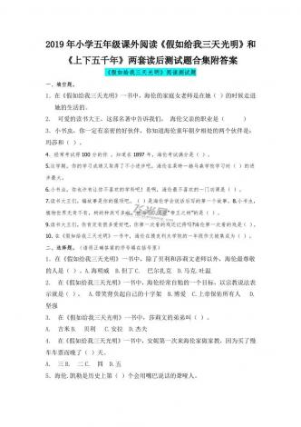 2019年小学五年级课外阅读《假如给我三天光明》和《上下五千年》两套读后测试题合集附答案