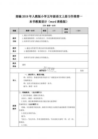 部编2019年人教版小学五年级语文上册习作推荐一本书教案设计(word表格版)
