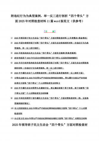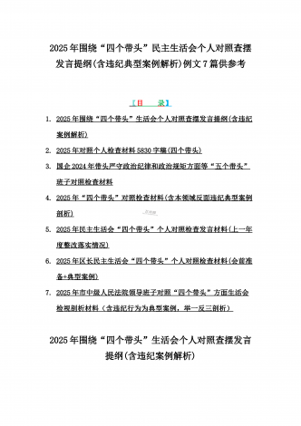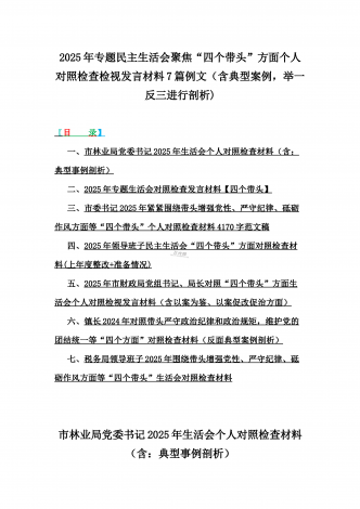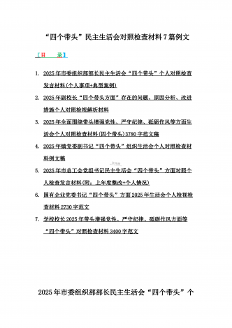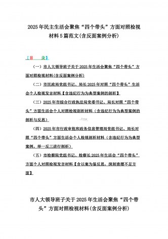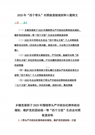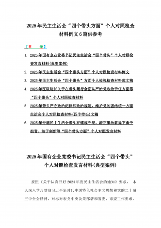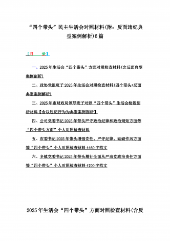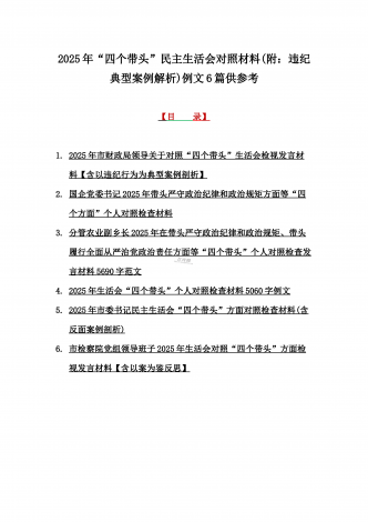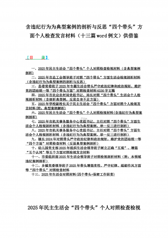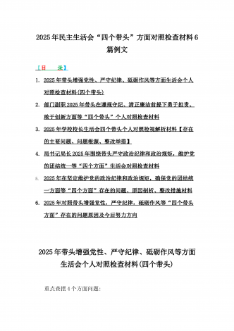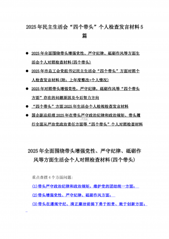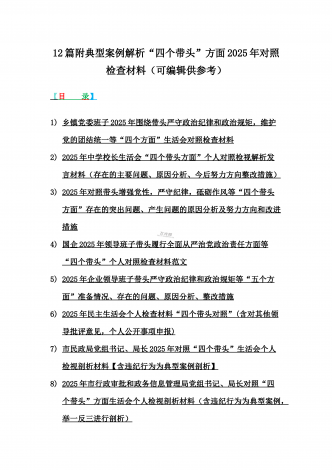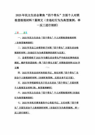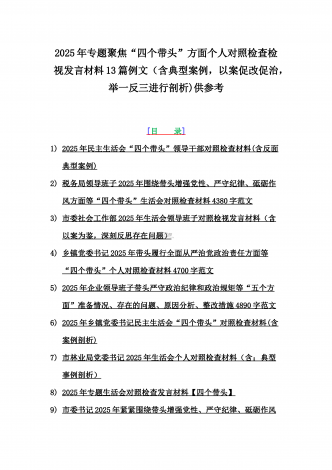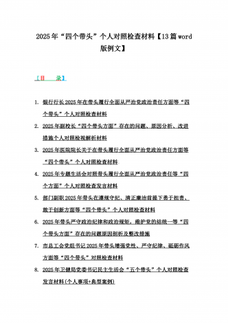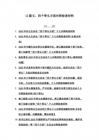2025年专题聚焦“四个带头”方面个人对照检查检视发言材料13篇例文(含典型案例,以案促改促治,举一反三进行剖析)供参考[目录]1)2025年民主生活会“四个带头”领导干部对照检查材料(含反面典型案例)2)税务局领导班子2025年围绕带头增强党性、严守纪律、砥砺作风方面等“四个带头”生活会对照检查材料4380字范文3)市委社会工作部2025年生活会领导班子对照检视发言材料(含以案为鉴,深刻反思存在问题)4)乡镇党委书记2025年带头履行全面从严治党政治责任方面等“四个带头”个人对照检查材料470...