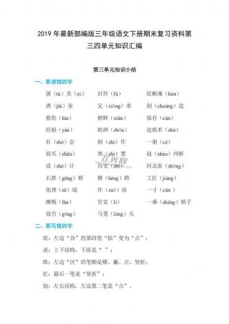 2019年最新部编版三年级语文下册期末复习资料第三四单元知识汇编