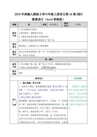 2019年部编人教版小学六年级上册语文第16课《盼》教案设计(word表格版)