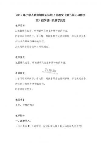 2019年小学人教部编版五年级上册语文《第五单元习作例文》教学设计及教学反思