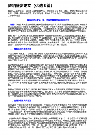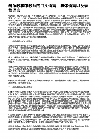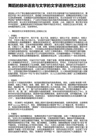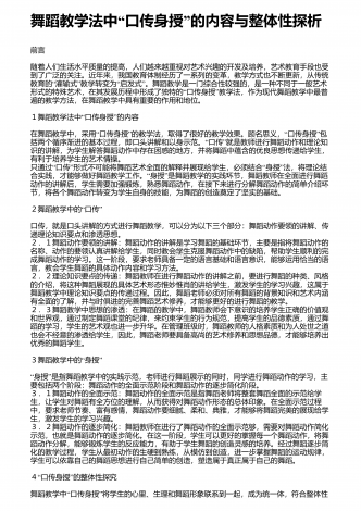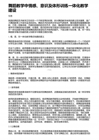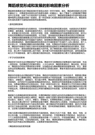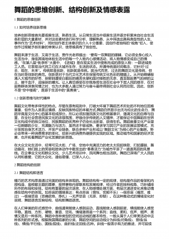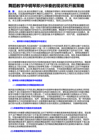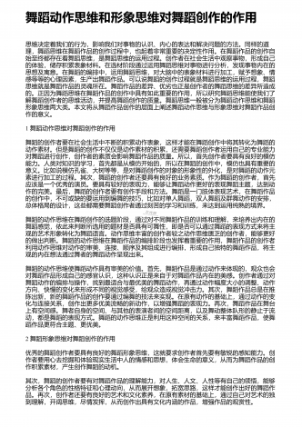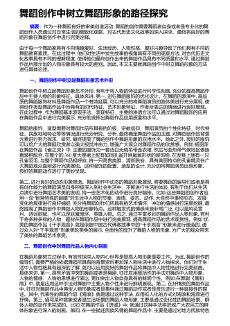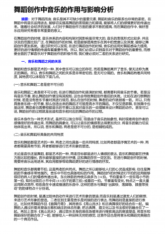 舞蹈创作中音乐的作用与影响分析 摘要:对于舞蹈而言,音乐是其不可缺少的重要元素,舞蹈和音乐的联系也非常的紧密。在舞蹈中将音乐运用进去,能够切实提高舞蹈的表现能力和意境,能够将人们的感情更好的传递出来。随着社会经济的发展,人们对于舞蹈创作方面的要求不断的提高,而在舞蹈创作中,做好音乐应用研究有着非常重要的意义。在舞蹈创作的时候,音乐体系的内容和构架对其影响是非常大的,音乐的表现形式比较多,并且涉及的范围比较广泛,在舞蹈创作的时候,若是能够提高音乐在其中的宽度以及深度,能够让舞蹈创作更加系统。通过...