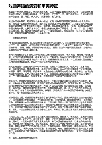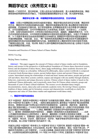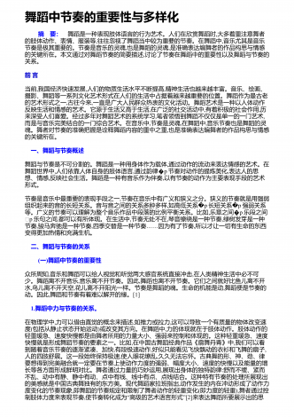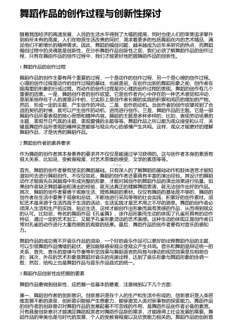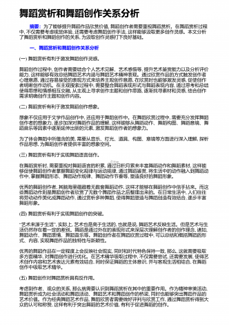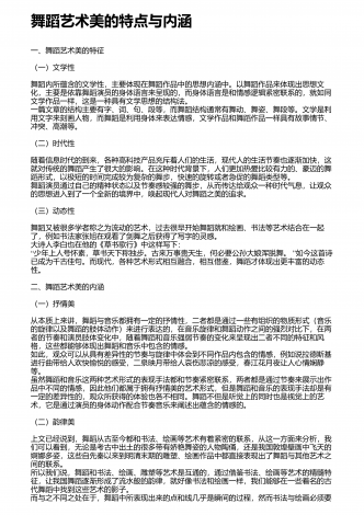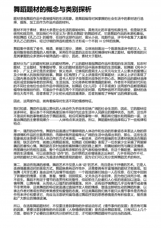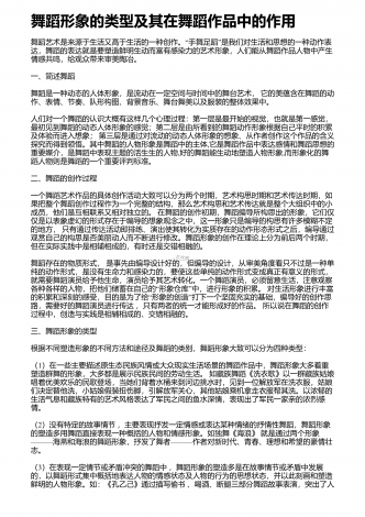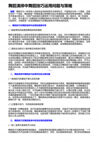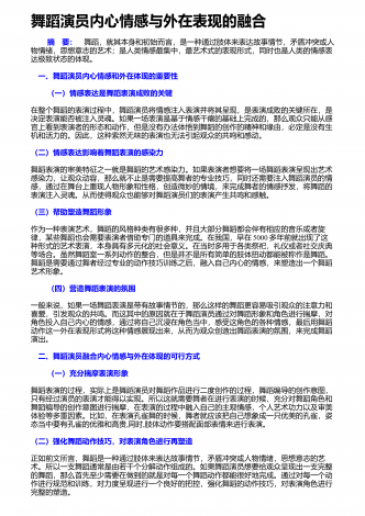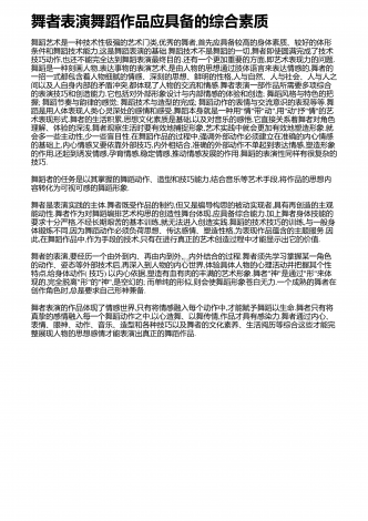 舞者表演舞蹈作品应具备的综合素质舞蹈艺术是一种技术性极强的艺术门类,优秀的舞者,首先应具备较高的身体素质、较好的体形条件和舞蹈技术能力,这是舞蹈表演的基础.舞蹈技术不是舞蹈的一切,舞者即使圆满完成了技术技巧动作,也还不能完全达到舞蹈表演最终目的.还有一个更加重要的方面,即艺术表现力的问题.舞蹈是一种刻画人物,表达事物的表演艺术,是由人物的思想通过肢体语言来表达情感的,舞者的一招一式都包含着人物细腻的情感、深刻的思想、鲜明的性格,人与自然、人与社会、人与人之间以及人自身内部的矛盾冲突,都体现了人物...