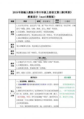 2019年部编人教版小学六年级上册语文第1课《草原》教案设计(word表格版)