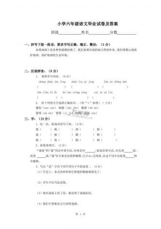 小学六年级语文毕业模拟试卷及答案1