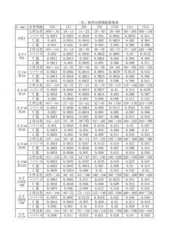 孔、轴用光滑极限量规表公差等级IT6IT7IT8IT9IT10IT11IT12工件公差0.00150.00220.00280.0040.00520.00750.0110.0010.00120.00160.0020.00240.0030.0040.0010.0160.0020.0030.0040.0060.009工件公差0.0020.00270.00360.00520.00650.010.01350.00120.00140.0020.00240.0030.0040.0050.00140.0020....
