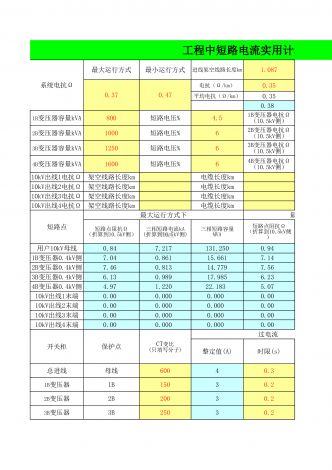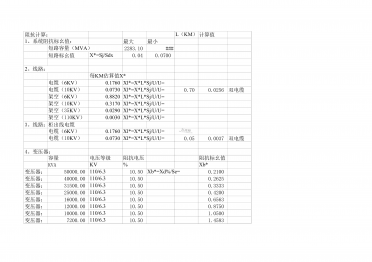 阻抗计算:计算值最大最小2283.10###短路标幺值X*=Sj/Sdx0.040.07000.1760Xl*=X*L*Sj/U/U=0.0730Xl*=X*L*Sj/U/U=0.700.0256双电缆0.8820Xl*=X*L*Sj/U/U=0.3170Xl*=X*L*Sj/U/U=0.0290Xl*=X*L*Sj/U/U=0.0030Xl*=X*L*Sj/U/U=柜出线电缆0.1760Xl*=X*L*Sj/U/U=0.0730Xl*=X*L*Sj/U/U=0.050.0037双电缆容量电压等...