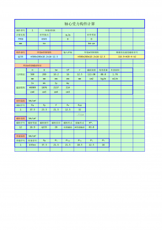 轴心受力构件计算钢件型号1计算长度杆件轴力杆件弯矩7950650500mmKnkN-cm构件钢号输入样板摩擦型高强度螺栓型号Q235H500x200x10.2x16-12.5H500x200x10.2x16-12.5J10.9-M20-4-X2几何特征HBtwtfr截面面积每米重量外表面积50020010.21612.5113.0888.81.76mmmmmmmmmmcm2kg/mm2/m截面特性IxWxIyWy4690918762137214cm4cm3cm4cm3材料强度钢材序号fufyff...
