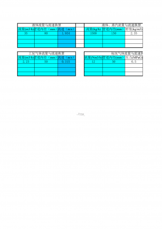液体流量与流速换算液体、蒸汽流量与流速换算35801.93415001502.35工况气体流量与流速换算标况气体流量与流速换算2.23500.31512500.5流量(m3/h)管道内径(mm)流速(m/s)流量(kg/h)管道内径(mm)密度(kg/m3)流量(m3/h)管道内径(mm)流速(m/s)流量(Nm3/h)管道内径(mm)压力(MPaG)液体、蒸汽流量与流速换算10.033标况气体流量与流速换算250.312流速(m/s)温度(C)流速(m/s)......