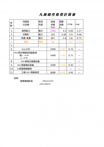 用電單負荷設備需要位名稱性質容量系數(kw)1車間動力動力24960.30.651.172空壓机動力2250.850.90.483動力6970.90.80.754照明照明8010.51.7356以上小計34980.470.72—734980.420.71—k=0.938—934980.420.93—10——1134980.430.92—九廠細作負荷計算表序號COSψtanψKd吸塵.集塵380v側未補償時的總負荷取k=0.90380v側無功補償容量380v側補償后容量S9型變壓器損耗工廠10KV...