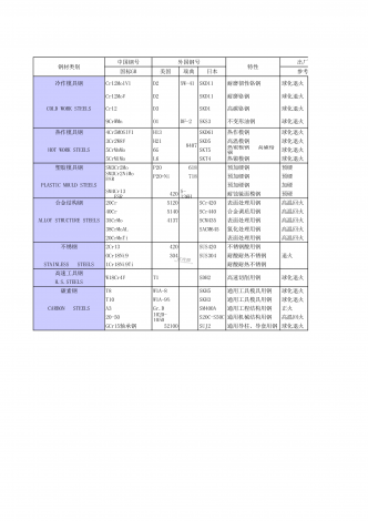钢材类别中国钢号外国钢号特性出厂状态美国瑞典日本参考硬度冷作模具钢Cr12Mo1V1XW-41SKD11耐磨韧性铬钢球化退火D2SKD11耐磨铬钢球化退火COLDWORKSTEELSCr12SKD1球化退火9CrWMnO1DF-2SKS3不变形油钢球化退火热作模具钢4Cr5MOSIV1H138407SKD61热作模钢球化退火3Cr2W8VH21SKD5高温模钢球化退火HOTWORKSTEELS5CrMnMo6GSKT5球化退火5CrMiMoL6SKT4热锻模钢球化退火塑胶模具钢P20618预加硬...