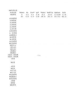 负荷名称Pe(kw)KxPc(kw)Sc(KVA)Qc(kvar)Ic(A)310.60.90.4818.620.6715.0139931.403610.550.750.88198.55264.73318.3721402.22消防中心AB负荷总表CosΦtgΦA栋照明A走道照明A-4F照明A-3F照明A-2F照明A-1F照明A-1F空调A顶层照明A一层景观A疏散指示B-2F照明B-1F照明A应急照明B应急照明A消火泵B消火泵A喷淋泵B喷淋泵A客消二用电梯B客消二用电梯A水泵B水泵A送风B送风A充...