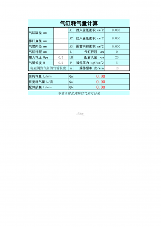 气缸耗气量计算A10.000A20.000A30.000L00.5LH200.2P5电磁阀到气缸的气管长度n10Qn0.00Qa0.00Qb0.00本表计算公式摘自气立可目录气缸缸径mm推入受压面积cm^2拉入受压面积cm^2推杆直径mm气管内径mm配管内径面积cm^2气缸行程mm气缸行程cm输入气压Mpa配管长度cm气管长度M操作压力kgf/cm^2操作频率次/min总耗气量L/min往复耗气量L/次配件损耗L/min......