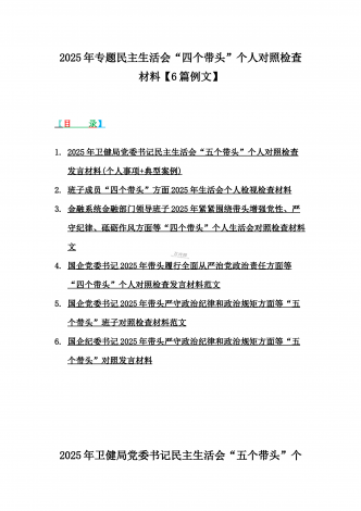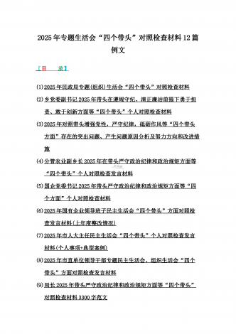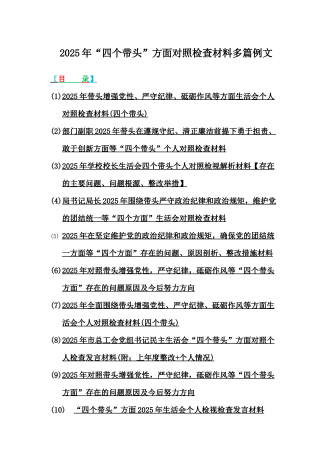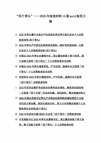 2025年含违纪行为为典型案例,举一反三进行剖析聚焦“四个带头”方面对照检视材料10篇word版范文【供参考】【目录】1)2025年领导班子民主生活会“四个带头”方面对照检查材料(上年度整改+准备情况)2)2025年团市委领导班子对照“四个带头”方面生活会检视剖析材料(含违纪行为为典型案例,举一反三进行剖析)3)2025年医保局局长民主生活会“四个带头”方面发言提纲(附典型案例)4)政协党组班子2025年生活会对照检查材料(四个带头+反面典型案例解析)5)2025年市行政审批和政务信息管理局领导...