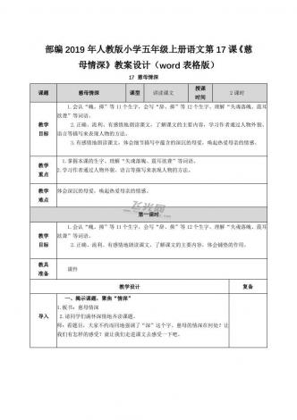 部编2019年人教版小学五年级上册语文第17课《慈母情深》教案设计(word表格版)