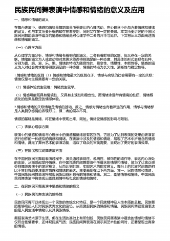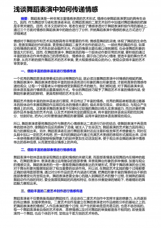 浅谈舞蹈表演中如何传递情感 摘要:舞蹈表演是一种非常注重情感渗透的艺术形式,情感也使舞蹈表演更加的具有生命力。因而,作为舞蹈学习者和表演者来说,在舞蹈表演的二度艺术创作中加强对舞蹈情感的把握是非常关键的。因而,在本文的研究中,笔者在肯定了情感渗透对于舞蹈表演积极作用的基础上,通过三个方面对情感在舞蹈表演中的融合进行了分析,并就舞蹈表演中情感的表达方式进行了详细阐述情感对于舞蹈创作和艺术实践都具有非常重要的作用,情感是舞蹈的灵魂,体现了舞蹈的生命色彩,是激发舞蹈创作的源泉,更是推动舞蹈二度艺术创...