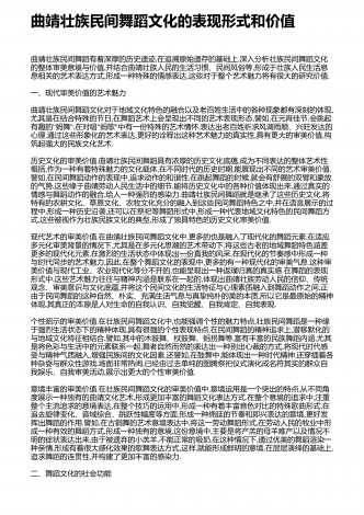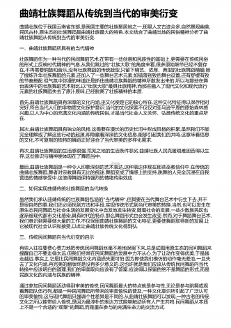 曲靖壮族舞蹈从传统到当代的审美衍变曲靖壮族位于我国云南省东部,是我国主要的壮族聚居地之一,那里人文古迹众多,自然景观幽美,民风古朴,原生态的壮族舞蹈是曲靖壮族最大的特色.本文结合了曲靖当地的民俗精神分析了曲靖壮族舞蹈从传统到当代的审美衍变.一、曲靖壮族舞蹈所具有的当代精神壮族舞蹈作为一种当代的民间舞蹈艺术,在带有一些创意和民族性的基础上,更需要在传统民俗的形式上反映时代精神的气息,从我们跳过的"壮族大歌"的角度来看,很多原始细节已经不复存在,不再需要铜鼓和音乐,没有壮族舞蹈的传统蛙型,只留下精艺...