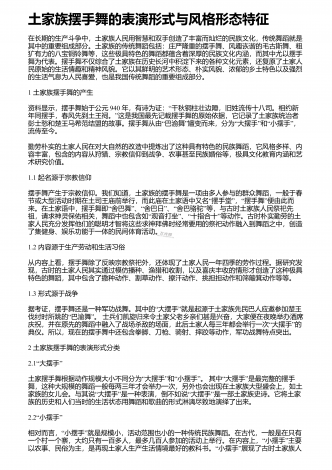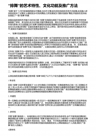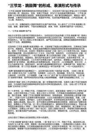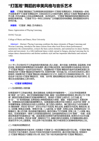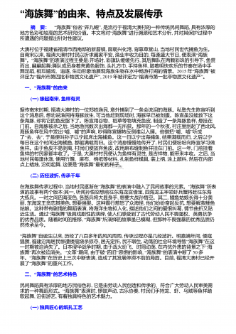 “”海族舞的由来、特点及发展传承 摘 要:“”“”海族舞俗名弄九鲤,是流行于福清大澳村的一种传统民间舞蹈,具有浓厚的“”地方色彩和较高的艺术研究价值。本文将对海族舞进行溯源和艺术分析,并对其保护过程中所遭遇的问题提出针对性建议。大澳村位于福建省福清市西南部的新厝镇,面朝兴化湾,背靠草堂山,当地村民世代捕鱼为生。自南宋以来,福清大澳村村民以祈求阖家平安,渔业丰收为目的,每逢盛大节日,“便表演海族”“”舞。海族舞的表演过程主要是:开场时,彩旗队缓缓先行,其后舞队在两颗彩珠的引导下,鱼贯而出,...
