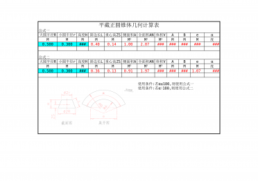 平截正圆锥体几何计算表公式一ABeαMMMMMMMM度0.5000.300###0.400.141.002.07###############公式二ABeαMMMMMMMM度0.5000.300###0.360.130.911.97#########1.07###大圆半径R小圆半径r高度H斜边长L重心高ZS侧面积A全面积AN体积VM2M2M3大圆半径R小圆半径r高度H斜边长L重心高ZS侧面积A全面积AN体积VM2M2M3使用条件:若α≤180,则使用公式一使用条件:若α>180,则使用公式二正圆...