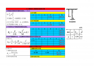 人工接地体工频接地电阻的计算ρlbd0.000#DIV/0!ρlbd0.000#DIV/0!ρLhdA#DIV/0!#DIV/0!#DIV/0!计算公式ρSLhd40.000#DIV/0!#DIV/0!#DIV/0!接触电压和跨步电压计算公式t40.0000.200581.378#DIV/0!1.单根垂直接地体的接地电阻R0(l》d)(1)对于扁钢R0(2)对于等边角钢R02.不同形状水平接地体的接地电阻R0R03.以水平接地体为主,且边缘闭合的复合接地体的接地电阻Rw1.接触电势允许值1.接触...