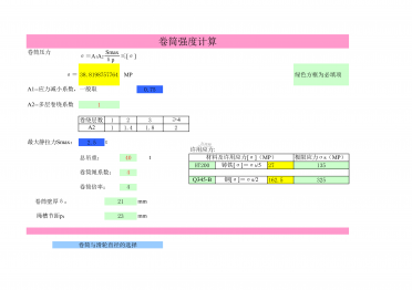 卷筒强度计算卷筒压力Smax38.8198757764MP绿色方框为必填项0.751卷绕层数123A211.41.822.5t总吊重:40tHT20027135卷筒绳系数:4Q345-B162.5325卷筒倍率:421mm23mm卷筒与滑轮直径的选择σ=A1A2≤[σ]δpσ=A1--应力减小系数,一般取A2--多层卷绕系数≥4最大静拉力Smax:许用应力:材料及许用应力[σ](MP)极限应力σs(MP)铸铁[σ]=σb/5钢[σ]=σs/2卷筒壁厚δ:绳槽节距p:按钢丝绳中心计算的卷筒和滑轮的...