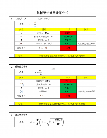 机械设计常用计算公式1正应力计算(或表面压应力)公式参数说明计算附注σ35.71W10000.00A280.00许用压(拉)应力200.00强度条件合格说明:绿色单元格是原始参数需填入,红色单元格是结果2剪切应力计算公式参数说明计算附注71.4320000.00A280.00许用切应力200.00强度条件合格说明:绿色单元格是原始参数需填入,红色单元格是结果3冲击载荷计算公式正应力(Mpa)拉伸或压缩载荷(N)截面积(mm^2)抗拉强度/安全系数剪切应力(Mpa)剪切力载荷(N)截面积(mm^2...