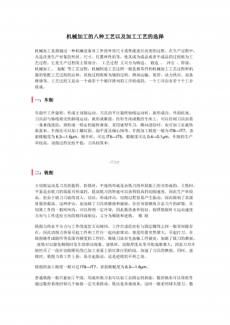 机械加工的八种工艺以及加工工艺的选择机械加工是指通过一种机械设备对工件的外形尺寸或性能进行改变的过程。在生产过程中,凡是改变生产对象的形状、尺寸、位置和性质等,使其成为成品或者半成品的过程称为工艺过程。它是生产过程的主要部分。工艺过程又可分为铸造、锻造、冲压、焊接、机械加工、装配等工艺过程,机械制造工艺过程一般是指零件的机械加工工艺过程和机器的装配工艺过程的总和,其他过程则称为辅助过程,例如运输、保管、动力供应、设备维修等。工艺过程又是由一个或若干个顺序排列的工序组成的,一个工序由有若干个工步组...