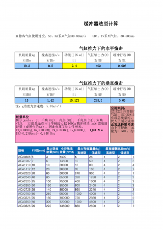 缓冲器选型计算气缸推力下的水平撞击E119.20.52.44020.006气缸推力下的垂直撞击E1151.4215.123245.50.03亚德客气缸使用速度:SC、MA系列气缸30-80mm/sSDA、TN系列气缸:30-500mm/s无杆、滑台气缸:50-400mm/s负载质量kg撞击速度m/s动能{J(N.m)}气缸输出力(N)缓冲行程(M)右图m右图v右图F右图L负载质量kg撞击速度m/s动能{J(N.m)}气缸输出力(N)缓冲行程(M)右图M右图V右图F右图S注:g为重力加速度:9.8...