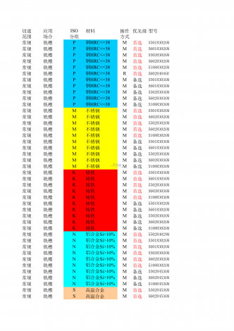 切速应用ISO材料操作优先级型号范围场合分组方式常规铣槽PM首选5501R302GM常规铣槽PM首选5601R302GM常规铣槽PM首选5502R302GM常规铣槽PM首选5602R302GM常规铣槽PM首选5108R302GM常规铣槽PR首选5602R404GR常规铣槽PM备选5501R303GM常规铣槽PM备选5601R303GM常规铣槽PM备选5502R303GM常规铣槽PM备选5602R303GM常规铣槽PM备选5108R303GM常规铣槽M不锈钢M首选5501R302GM常规铣槽M不锈...