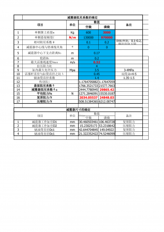 减震器阻尼系数的确定项目单位数值备注空载满载1Kg60030002N/m13000097000030.10.24减震器中心线与铅垂线夹角°005m0.176m0.27m/s0.528拉压阻力比49缸内最大允许压力Mpa3.53-4MPa100.4511储油筒直径系数1.41.35-1.5121.17647058821.17647059131766.352173321577.7663142444.778094529865.4215N1271.284609115530.0187162034.0553...