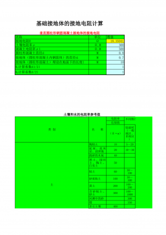 基础接地体的接地电阻计算垂直圆柱形钢筋混凝土接地体的接地电阻名称单位数值Ω18.35041Ω.M300Ω.M500M0.8M0.7M1011d/2l;d1/2l类别名称电阻率近似值土陶粘土1020捣碎的木炭4050粘土60砂质粘土100黄土200300河滩中的砂300煤350多石土壤400接地电阻R土壤电阻率ρ混凝土电阻率ρ1圆柱形混凝土直径d接地体(圆柱形混凝土内钢筋体)的直径d1接地体(圆柱形混凝土)埋设在地面下的长度lK1计算系数d1/2lK2计算系数d/2l土壤和水的电阻率参考值不同情况...