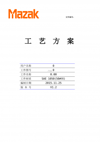 文件编号:工艺方案用户名称0工件图号0工件名称0.00工件材质编制日期2015.11.25版本号V1.2SAE1050(50#钢)批准审核编制尊敬的用户:非常感谢贵公司对LGMazak小巨人机床的信任,并给予我们为本项目提供技术方案的机会。本公司根据贵公司所提供的信息,包括加工零件的图纸、工艺、加工要求和节拍要求等,进行了详细的分析计算,作出了完整的方案和建议,以响应贵公司的要求。贵公司在审议本方案时若有疑问,请与我们联系:一、资料来源:用户名称0代理商工件名称0.00图号0工件材质毛坯状态热处...