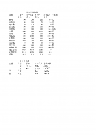 居室家庭负荷名称工作制最小最大最小最大照明100200200400长电风扇6012060120长电冰箱8012080120长洗衣机100300100300短电视机100300100300长短空调1000100010002000长音响100300100300短电饭锅60020006002000短计算机300500300500长微波炉95012009501200短录音机50505050长吸尘器60010006001000短电热水器2000300020003000短设备容量60409940614011...