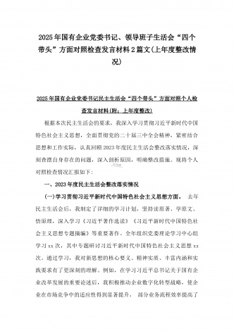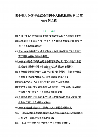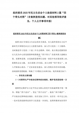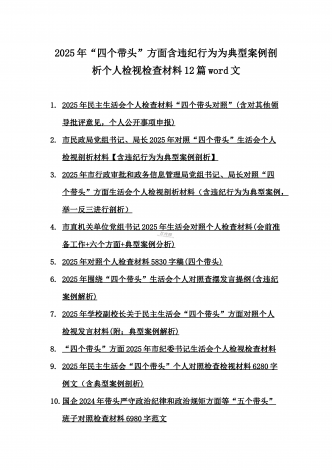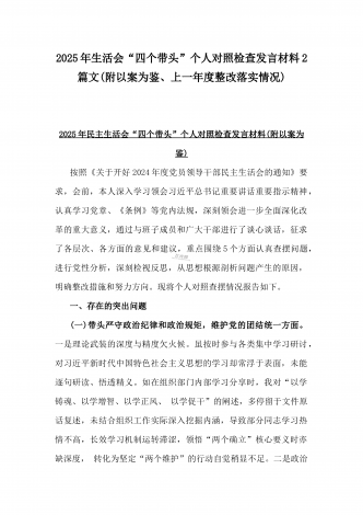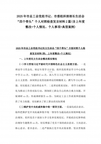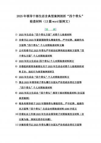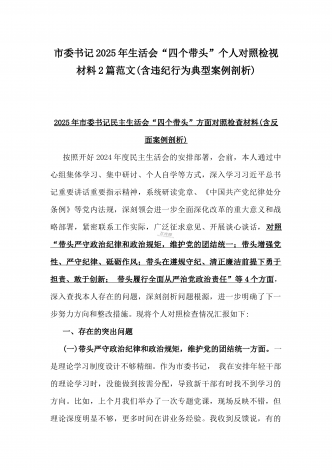2025年教育局党委书记、市财政局党组书记、局长对照“四个带头”方面生活会个人对照检视发言材料2篇文(含典型案例+个人事项、以案为鉴方面)2025年教育局党委书记民主生活会“四个带头”个人对照检查发言材料(典型案例+个人事项)在2024年民主生活会上,我围绕本次会议主题,结合自身思想和工作实际,深入进行自我检视剖析,查找问题不足,现将个人对照检查情况汇报如下。一、存在的主要问题(一)带头严守政治纪律和政治规矩,维护党的团结统一方面。一是政治理论学习深度不够。虽然积极参加各类政治学习活动,但对习近...
