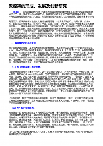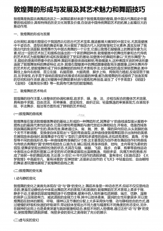 敦煌舞的形成与发展及其艺术魅力和舞蹈技巧敦煌舞是我国古典舞蹈流派之一,其舞蹈素材来源于敦煌莫高窟的壁画,是中国古代舞蹈史中重要的组成部分,具有特殊的历史文化背景及价值,在促进中国传统舞蹈艺术的拓展上起着巨大的推动作用.一、敦煌舞的形成与发展众所周知,敦煌石窟是位于我国西北位的古代艺术宝库,蕴涵着博大精深的中国文化.尤其是壁画中千姿百态、造型优美的舞姿形象,充分展现了我国古代人民的智慧和文化素养,真实反映了我国古代的生活面貌.敦煌舞作为中国古典舞的一个分支,它是以敦煌石窟壁画上的舞姿形象为元素,经...