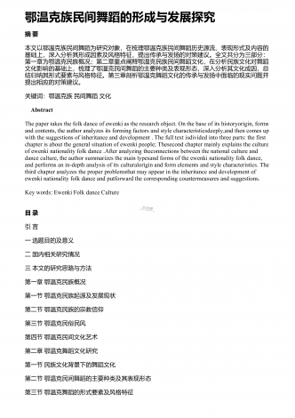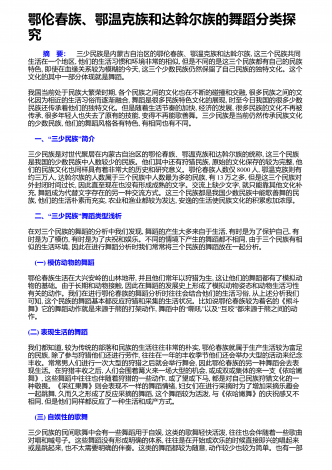 鄂伦春族、鄂温克族和达斡尔族的舞蹈分类探究 摘 要:三少民族是内蒙古自治区的鄂伦春族、鄂温克族和达斡尔族,这三个民族共同生活在一个地区,他们的生活习惯和环境非常的相似,但是不同的是这三个民族都有自己的民族特色,即使在血缘关系较为模糊的今天,这三个少数民族仍然保留了自己民族的独特文化。这个文化的其中一部分体现就是舞蹈。我国当前处于民族大繁荣时期,各个民族之间的文化也在不断的碰撞和交融,很多民族之间的文化因为相近的生活习俗而逐渐融合,舞蹈是很多民族特色文化的展现,时至今日我国的很多少数民族...