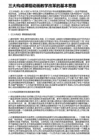 三大构成课程动画教学改革的基本思路《三大构成》,自20世纪80年代末,已作为艺术设计专业的重要基础课程之一,包含平面构成、色彩构成、立体构成,在整个课程设置中占有重要地位.如今已在我国各大美术院校中广泛应用,它既培养了艺术设计专业学生的构思创造能力,同时也提高了学生的艺术鉴赏水平.因此,成为艺术设计专业中非常重要的专业基础课.而同属于设计门类的动画专业,《三大构成》也被纳入到其教学体系中.在动画作为一门独立学科之前,三大构成就已经形成了较为成熟且相对固定的教学体系以及教学模式.很多高校在开设动画...